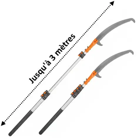 Cette scie d’Ă©lagage tĂ©lescopique vous permettra de couper aisĂ©ment les branches les plus hautes sans avoir recours Ă une Ă©chelle. LĂ©gère et extensible jusqu’Ă 3 mètres, elle est Ă©quipĂ©e de systèmes de verrouillage pour plus de sĂ©curitĂ©.
